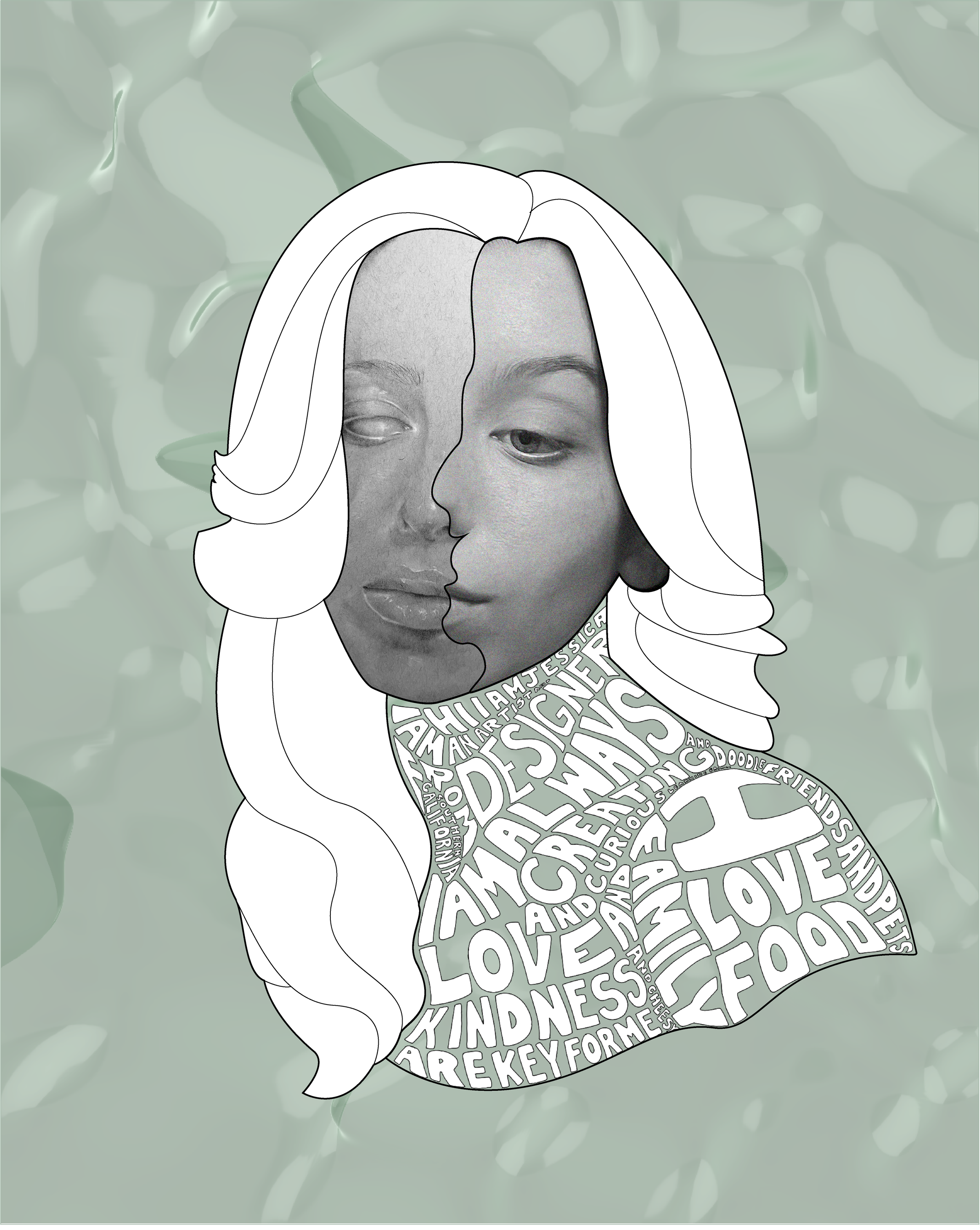 To the left is a self-portrait comprised of different sections that represent the media I work in.